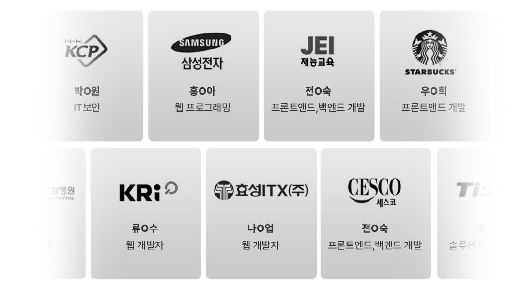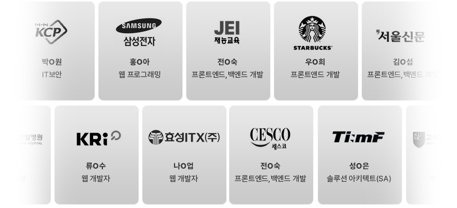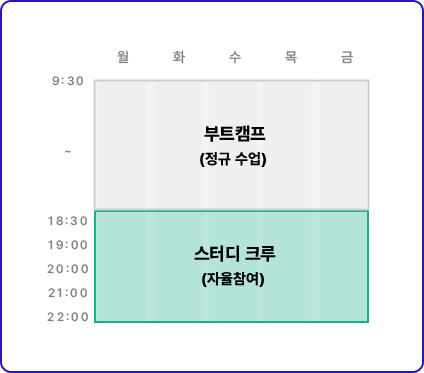 목록으로 K-디지털 UX/UI디자인 웹 프론트엔드개발 부트캠프 (생성형AI 활용/피그마) 교육기간 정규 6개월 교육비 2026 정책 변경으로 자부담 10% 도입, 훈련수당으로 실부담 O원 K-디지털 ·국기 · 취준생 과정 90% ~ 최대100% 지원 지금 합류하면 혜택 ALL 제공 500만원 상당 AI+실무 활용 인강 50+ 협력기업 취업연계 (면접 멘토링) 매월 20~80만원 훈련수당 지급 온라인 학습 시스템 제공 · 교재 지원 1차 개강04월 14일(화) 2차 개강04월 30일(목) WHY? UXUI 웹·프론트엔드 개발 부트캠프 (생성형AI 챗GPT 활용)으로 시작해야 할까요? 피그마를 통한 UI/UX 디자인 역량 강화 + React를 활용한 인터랙티브한 웹 애플리케이션 개발 + Node.js로 서버 사이드 로직까지 처리 할 수 있고, UI/UX 디자인과 개발을 모두 아우르는 역량을 갖춘 프론트엔드 개발자 채용시장에서 뽑히는 개발자로 성장합니다. Start now “다른건 몰라도 취업 할 수 있으니깐 시작했다!” 50개+협력기업과 함께! 취업까지 직행! 현업 고수들과 실전 프로젝트를 경험하면서, 흐름만 잘 따라가도 실력은 자연스럽게 성장하고, 50개+협력기업과 함께 원하는 취업까지 이룰 수 있어요. 프론트엔드 개발, 왜 배워야 할까요? 개발자로의 시작하기에 진입장벽이 낮고, 웹과 모바일 애플리케이션의 수요가 꾸준히 증가함에 따라 프론트엔드 개발자에 대한 수요도 매우 높으니까! 프론트엔드개발자 프론트엔드개발자는 전공과 경력보다 실력 위주 채용! 기초가 부족해도 진입장벽이 낮아 개발자로 시작하기 좋음 중요한 사용자 경험(UX)에 직접적인 영향을 미치고 있어 기업에서의 중요성이 높음 프론트엔드 채용공고 2700건 이상으로 높아지는 수요에 취업 가능성 높음 *사O인 프론트엔드 개발자 공고 기준 채용공고에서 프론트엔드 개발자 수요는 점점 증가하고 있습니다. UIUX 웹·프론트엔드 개발 부트캠프 (생성형AI 챗GPT 활용) 어떻게 진행되나요? 사전 수업 스타트 캠프개념 형성 학습 프론트엔드 기초 선행학습 정규 부트 캠프 적용/발전 (생성형 AI 활용) 프론트엔드 실전 + 미니 프로젝트 프로젝트 실전 5인 1개조 협업 프로젝트 현직 개발자 협업 프로젝트 진행 취업 성공 캠프 취업 성공 협력 기업 매칭 스터디크루(현직 개발자 튜터링/멘토링 + 스터디 그룹) 사전 수업 스타트캠프 기초 지식이 없어 혼자는 막막하다면? UXUI디자인·프론트엔드 개발의 시작, 사전 수업 스타트 캠프 운영으로 걱정 No! 디자인/코딩 기초가 없는 학생들을 위해 사전 교육을 제공하여 프로그래밍의 기본 개념과 사전학습을 통해 탄탄한 기초를 쌓고, 이를 바탕으로 프론트엔드 개발 시작을 든든하게 지원합니다. 기초 언어 이해 속도 PreClass 1차 1차 (온라인) IT용어집 제공 Html, CSS 기초 수업(2주) KDC 피그마(1~4주) PreClass 2차 2차 (오프라인) Html 기초 입문 CSS 기초 입문 / Javascript의 이해 실무예제(부트스트랩 활용) 페이지 작성 Regular Class 3차 (오프라인) 동기부여 2주 집중 보충수업 학습 스터디 크루 수준별 튜터링 정규 수업 부트 캠프 실무에 적응할 정도의 코딩 수준이 될까 걱정이라면? 체계적인 정규 수업 부트캠프로 문제 해결(실무) 능력 업그레이드! 제대로 만든 Curriculum을 배웁니다. 좋은 개발자의 핵심 실무 역량(문제해결역량) UP! 팀 프로젝트 진행 생성형 AI 활용 혼자는 어렵지만, 함께하면 빨라지고 쉬워집니다. 사용자 맞춤 설계가 자유롭고 브랜드 심미성을 살린 디자인 코드가 명확하고 이해하기 쉬운 코드 변경과 확장이 용이한 코드, 모듈화 할 수 있는 코드 당신의 UX·UI 디자인 & 코드 퀄리티가 달라집니다. 프론트엔드 개발에서 왜 생성형 AI(챗GPT)를 활용 해야 할까요? UX·UI 디자인 & 코드 작성 및 문제해결이 더 빨라지고 효율적으로 진행 ChatGPT 활용전 색상 부조화로 브랜드 심미성을 잘 살리지 못해 가치를 떨어트렸고, 사용자 맞춤 설계에 제한적이였습니다. ChatGPT 활용 후 디자인의 영감과 심미성을 고려한 색상을 추천받아 가치를 올리고, 개인화된 디자인 제안이 가능하게 됩니다. UX·UI 디자인에 생성형 AI를 활용 하면 좋은 이유! 데이터 리서치 빠른 정보 검색 및 분석 후 효율적으로 정리합니다. 사용자 플로우 다양한 사용자 시나리오 제공하여, UX 개선을 위한 영감을 얻을 수 있습니다. 경쟁사 분석 많은 시간이 필요한 경쟁사 웹사이트 및 마케팅 전략까지 빠르게 분석해 줍니다. UX 결함 개선 A/B 테스트 아이디어 제안합니다. 영감 및 색상 디자인의 영감이나 브랜드 가치의 심미성을 고려한 색상 조합을 추천합니다. ChatGPT 활용전 이중 for루프는 배열을 순차적으로 비교하므로 이해는 쉽지만, 큰 배열에서는 비효율적입니다. ChatGPT 활용 후 Set 객체의 중복을 허용하지 않는 특성을 활용하여 배열을 Set으로 변환하면 간단히 중복을 제거할 수 있습니다. 최적화 코드 작성하면 좋은 이유! 성능 향상 실행 속도가 빨라지고 메모리 사용이 줄어듭니다. 가독성 증가 간결해져 이해하기 쉽고 유지보수가 용이합니다. 에러 감소 복잡성을 줄여 버그 발생 가능성을 낮춥니다. 재사용성 모듈화되어 다른 프로젝트에서 재사용이 쉽습니다. 협업 용이 깔끔한 코드는 팀원들과의 협업을 원활하게 합니다. 최신 트